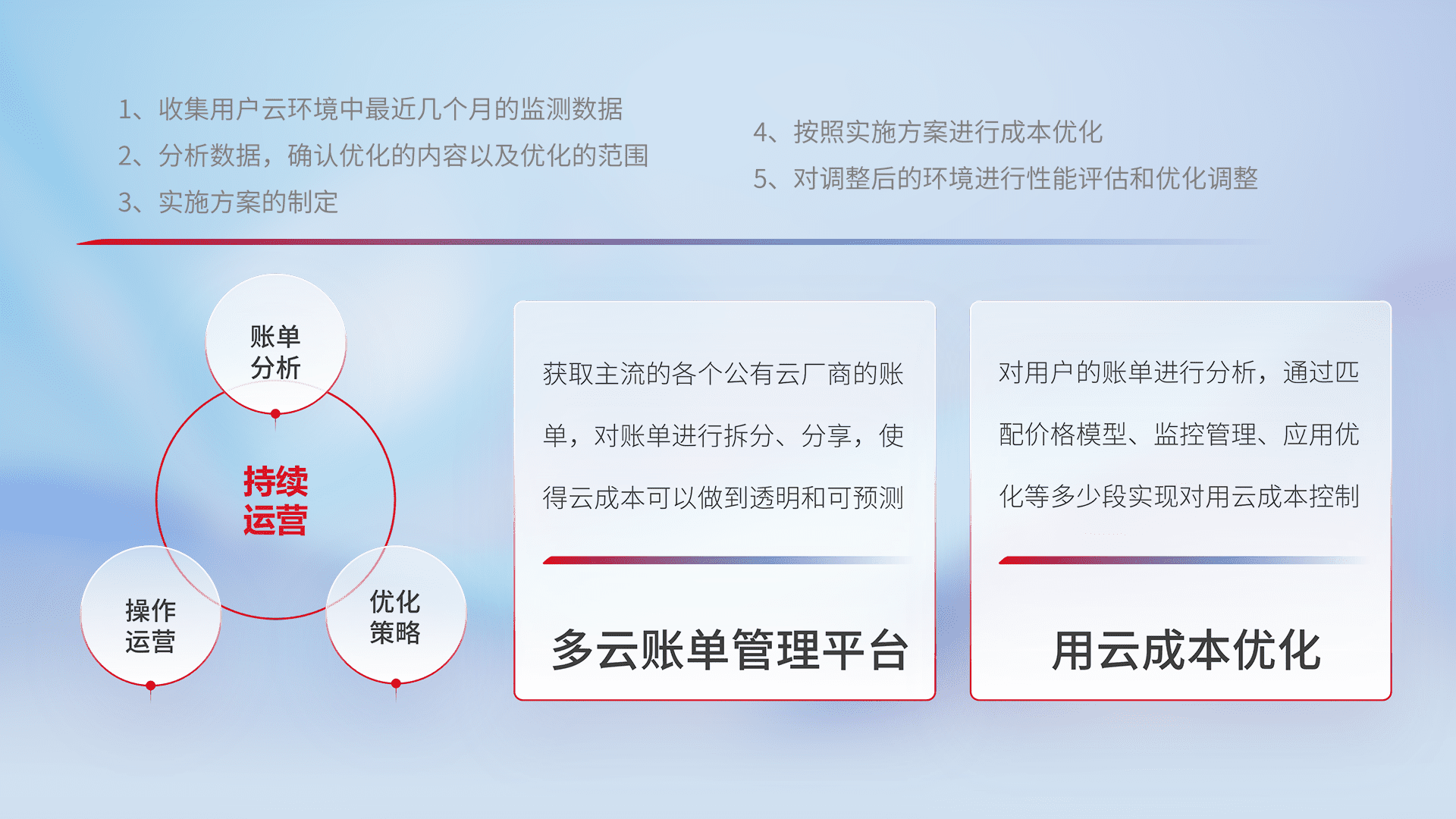 通过多云纳管,,,,以统一的资源数据模型把客户的云资源进行抽象和封装,,进而实现对多云资源的统一操作,,,,保障云资源管理的可靠性、、、稳定性与可用性。。量身定制化运维内容,,,,配置、、、开发运维、、、、补丁管理、、、、备份、、、、监控、、、认证和访问管理、、审计和日常巡检等,,保障在用云过程中的可靠度,,,,稳定度以及高可用率。。。