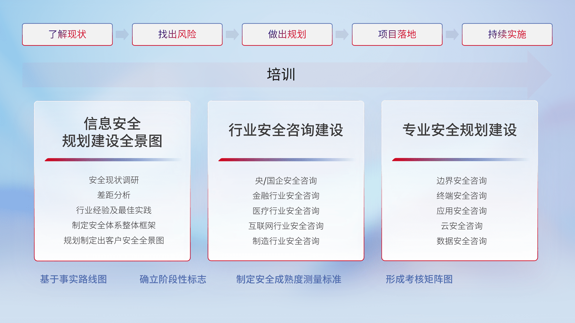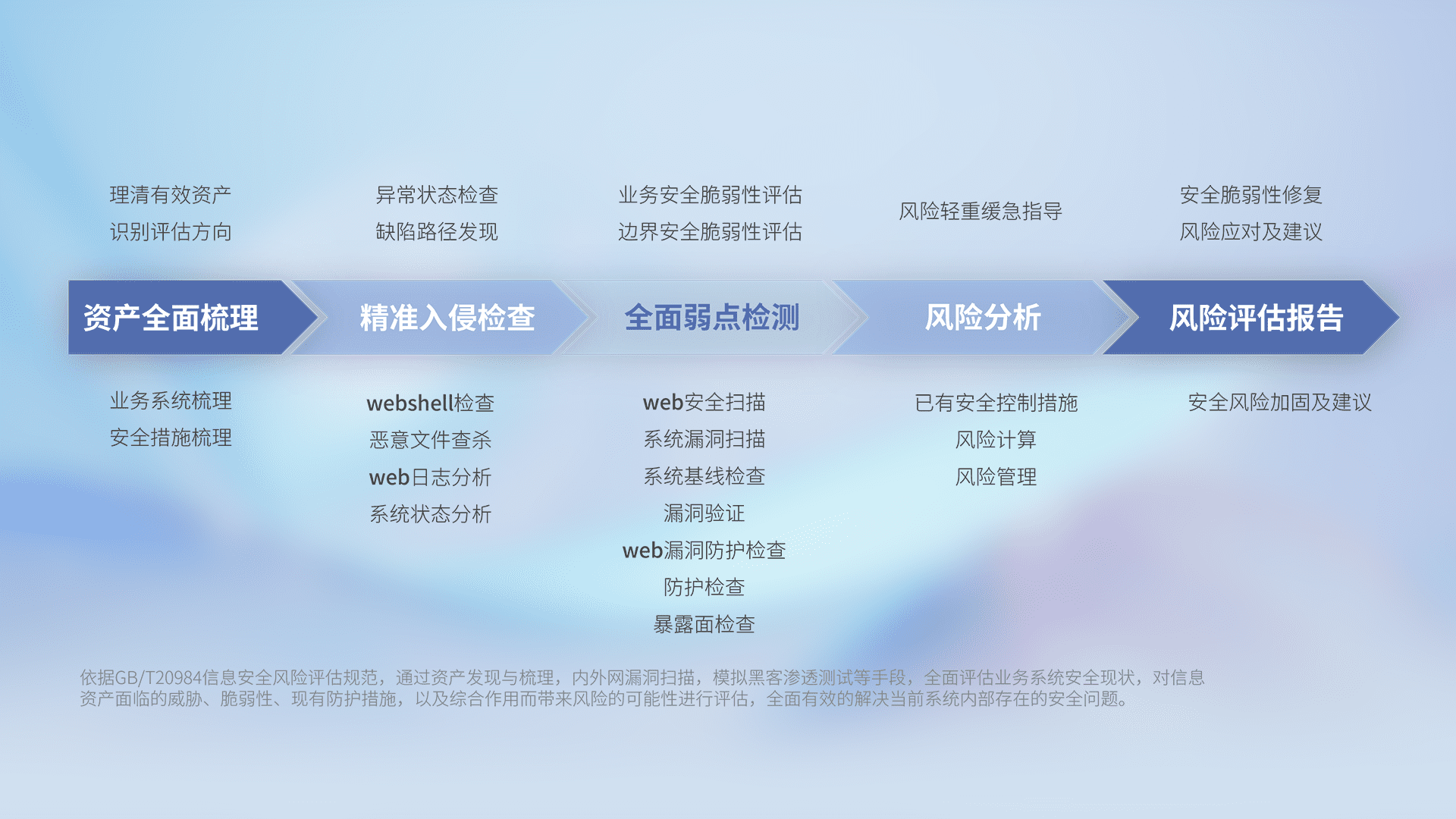 针对客户行业特性,,,,以专业的安全服务+多厂商联合解决方案提供专属的一站式安全管理服务,,,,帮助客户全面感知网络空间威胁,,,基于识别、、、检测、、、、分析、、、防护、、、、监测、、、、响应的服务理论模型,,从方案咨询、、、集成交付、、评估验证、、、、优化加固、、运维运营,,,,致力于为客户提供完整的闭环管理式安全服务。。以实战经验为客户打造高抵御风险的安全体系,,,,帮助客户发现威胁、、、、对抗威胁、、、处置威胁,,,不断积累安全对抗能力,,,持续保障数字化安全。。